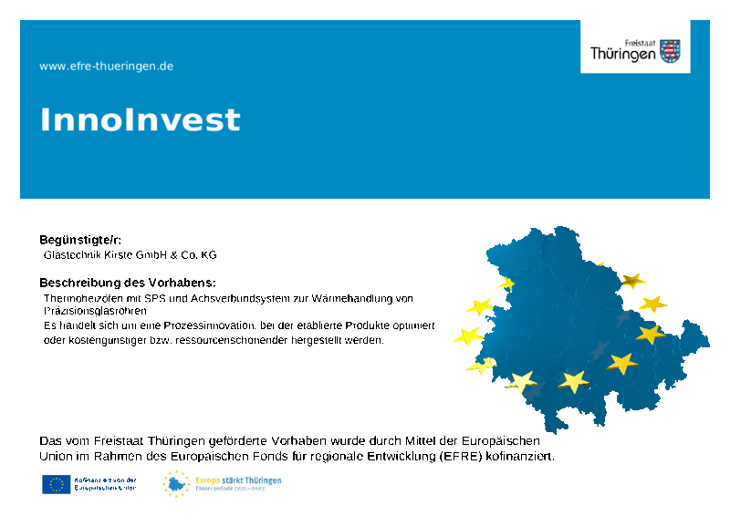 Die Glastechnik Kirste hat daher in moderne Thermoheizöfen mit automatischer Steuerung investiert und erreicht Energieeinsparungen von bis zu fünfzig Prozent beim Kalibrieren von Glasrohren. Dabei wurden die Steuerung und die Thermoheizöfen vom Hersteller individuell auf unsere Glasrohrkalibrierung ausgelegt.